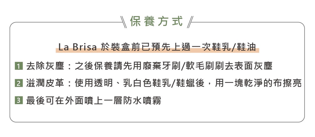 👉保養方式:La Brisa 於裝盒前已預先上過一次鞋乳/鞋油