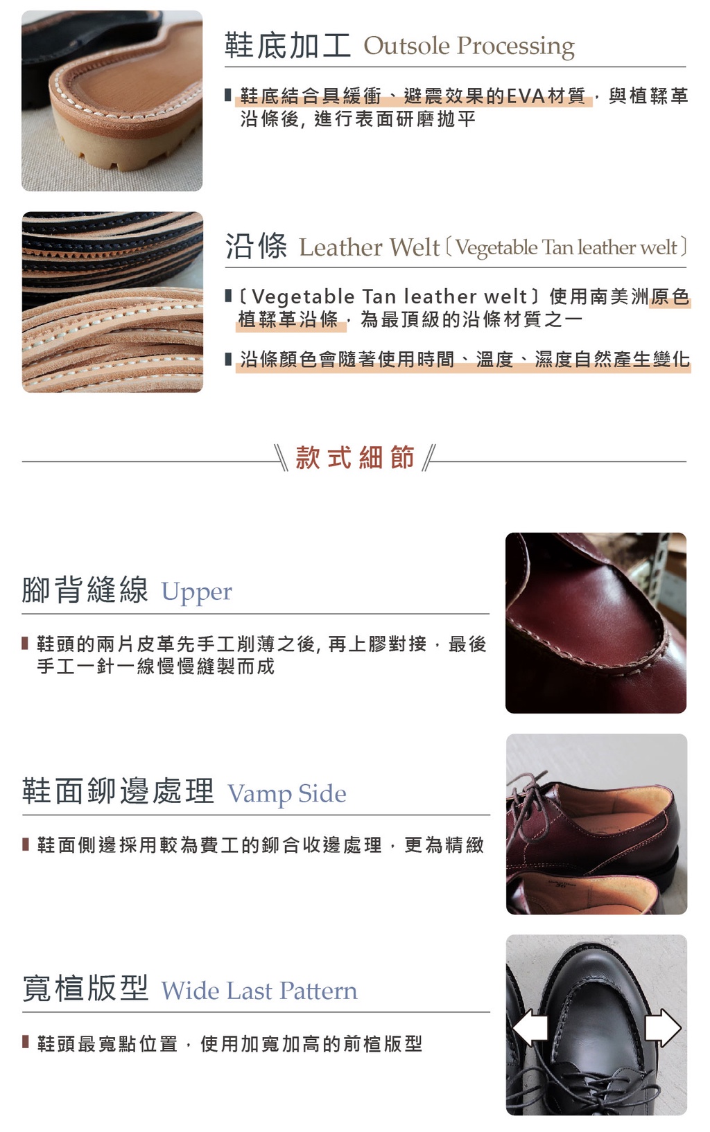 🔸鞋底採用全新開發的複合加工橡膠鞋底,中間層夾入EVA緩衝材質,貼合沿條之後再手工磨邊拋色處理